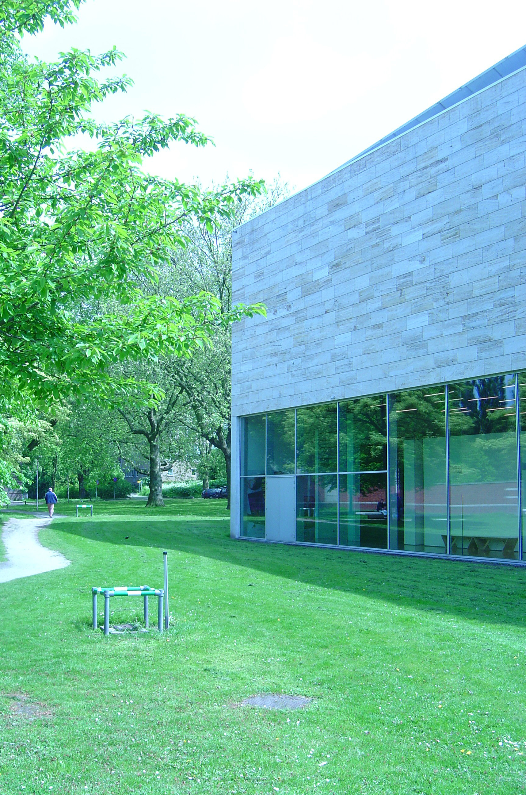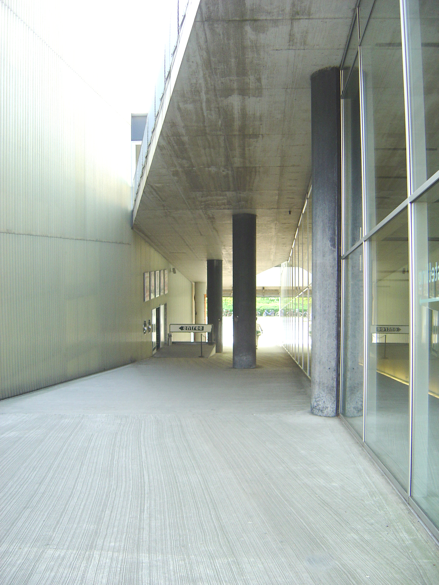 We maken een rondje: de entree is halverwege de passage en geeft toegang tot een langwerpige, oplopende ruimte met schuine kolommen, die als auditorium is ingericht. Vanaf hier is de grote zaal te bereiken. Deze is langwerpig en heeft de vorm van een kijkdoos met open deksel: licht valt door de dakramen op de grote tentoongestelde objecten. Daarnaast is een dubbelhoge, smalle zaal met tussenverdieping van metalen roosters en licht van opzij. De benedenvloer van deze ruimte is gekoppeld met een vierkante zaal met zicht op het park en kolommen als boomstammen, die op zijn beurt weer toegang geeft tot het schuin oplopende auditorium met de ingang.