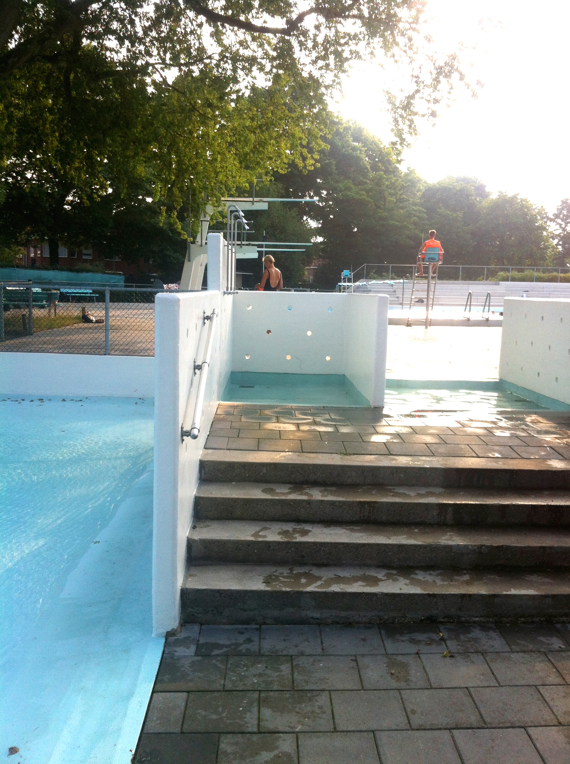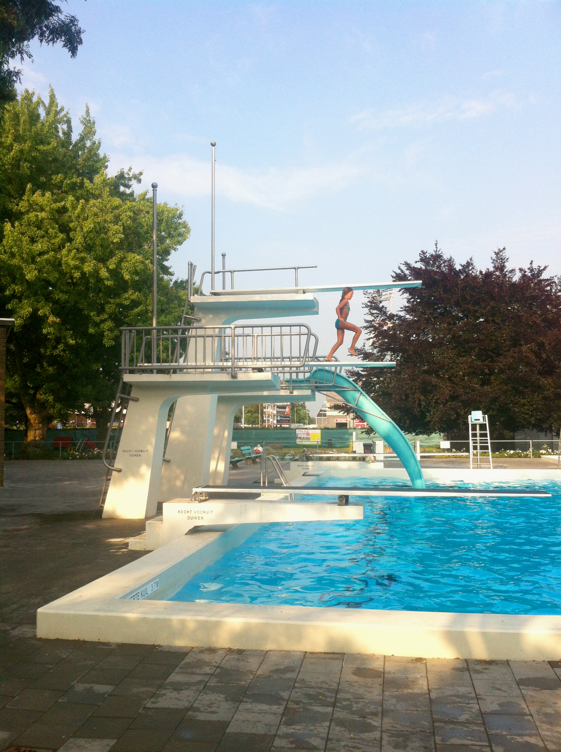 Al wandelend realiseerde ik me hoeveel geluk een simpel en doelmatig ontwerp kan oproepen. De gigantische witgepleisterde kuip met daarin verschillende zwembaden, werd bevolkt door een groep baantjestrekkende, duikende, ravottende of simpelweg rondhangende recreanten. Voor elke activiteit een eigen bad. Op de royale tribune aan de overkant van het bad lagen groepjes tieners terwijl op het grasveld direct bij de ingang kleinere kinderen rondrenden. Dit zwembad, nu 80 jaar oud, is nog altijd de aanleiding voor een zomer vol zwemvertier. Het biedt verfrissing op een warme dag en vormt een plek om elkaar te ontmoeten. Dit zwembad wérkt!