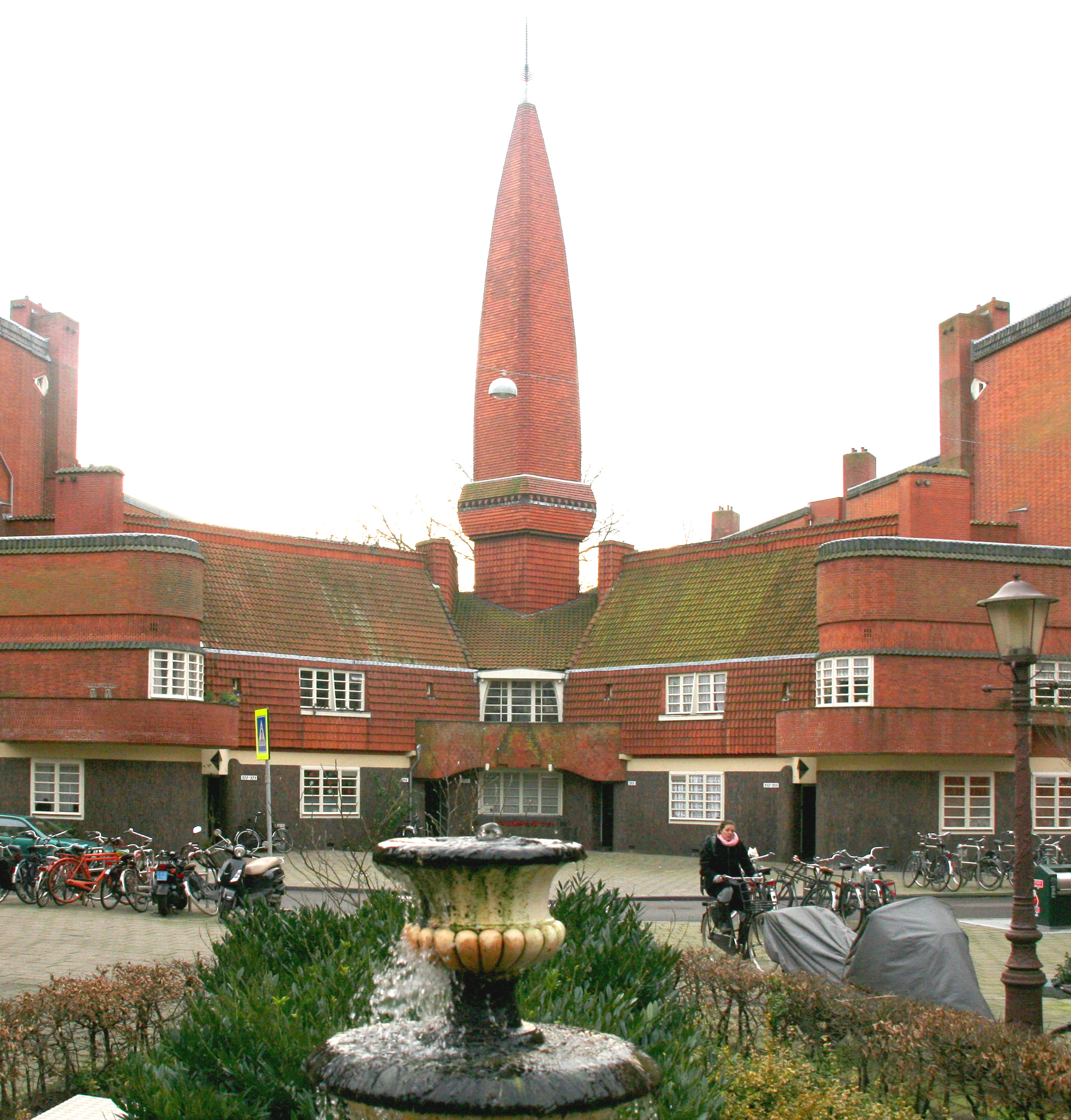 –De stijl die Michel de Klerk samen met zijn vakbroeders Piet Kramer en Jurgen van der Meij ontwikkelde, was onmiskenbaar een tussenstijl tussen het traditionalisme van hun oude werkgever Eduard Cuijpers en het radicaal moderne van ‘de Stijl’ en de Nieuwe Zakelijkheid. De architecten pasten traditionele bouwmaterialen als baksteen, dakpannen en houten kozijnen toe en bovendien stond de uitstraling van de gevel los van de functie van het gebouw, zoals wel vaker bij het werk van traditionalistische architecten. Maar tegelijk gebruikten de architecten nadrukkelijk geen referenties naar historische voorbeelden, zoals Modernistische tijdgenoten ook niet deden.