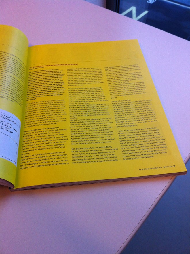 ‘A Mies for all, new technologies, new business models for architects’, op 11 november 2013 in Het Nieuwe Instituut. Sprekers: Matthijs Bouw, Pierre Bismuth (A Mies for All), Thomasz Jaskiewicz (Self building building), Jelle Feringa (EZTC architecture / Odico), Ben van Berkel (UN studio), Anne Filson, Gary Rohrbacher (AtFAB). Dragons: Lars Marsman (Proper Stok Heijmans), Boris Veldhuisen van Santen (serial internet entrepeneur), Bas van Dam (Being development), Mark Vernooij (THNK, Amsterdam school of creative leadership). Moderator: Brandan Cormier (managing editor Archis-Volume).