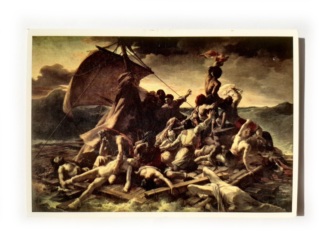 Dat vlot van de medusa is een idioot schilderij vol lijken, stervenden en een schip aan de horizon dat de schipbreukelingen zal redden. Het is gigantisch en hangt in een enorme zaal in het Louvre in Parijs. Op school leerde ik dat Géricault ter voorbereiding op dit schilderij speciaal naar mortuaria ging om de kleuraccenten op de huid van dode mensen te bestuderen. En dat dit schilderij qua thematiek helemaal past in de tijd van de Romantiek: een groepje nietige mensen dat is overgeleverd aan de krachten van de natuur.