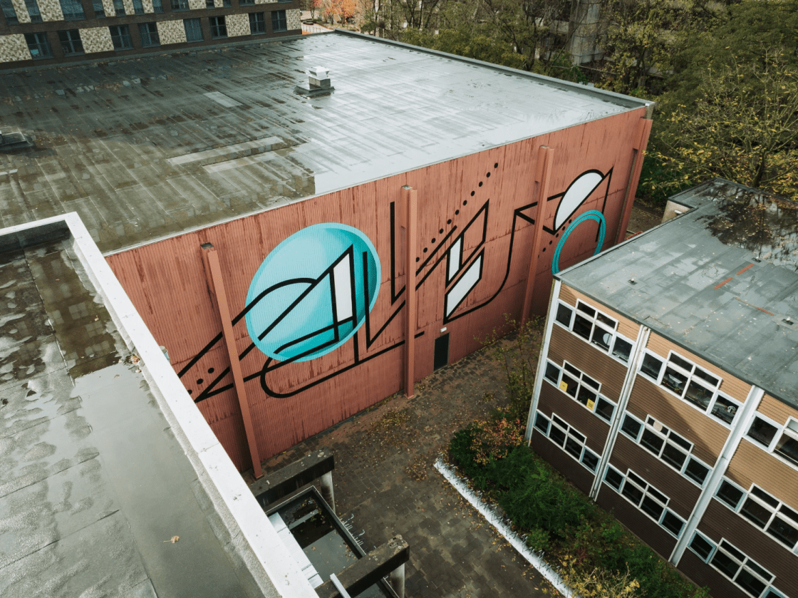 Deze mural is aangebracht op een oude sporthal die momenteel in gebruik is als het examencentrum. Studenten verlaten de examenhal via de deur linksonder de mural. Dit is dus het eerste dat ze zien. Het werk past wel op deze plek. Het groen-blauwe kleuraccent lijkt van de muur af te spatten en brengt wat leven in de verder eentonige omgeving. De aangebrachte vormen en lijnen zijn abstract, maar roepen toch associaties op met letters, diagrammen en schema’s. Lijkt het op de studieboeken waarop de studenten zo hard hebben zitten blokken? Na de passage van deze mural kunnen ze het weer achter zich laten.