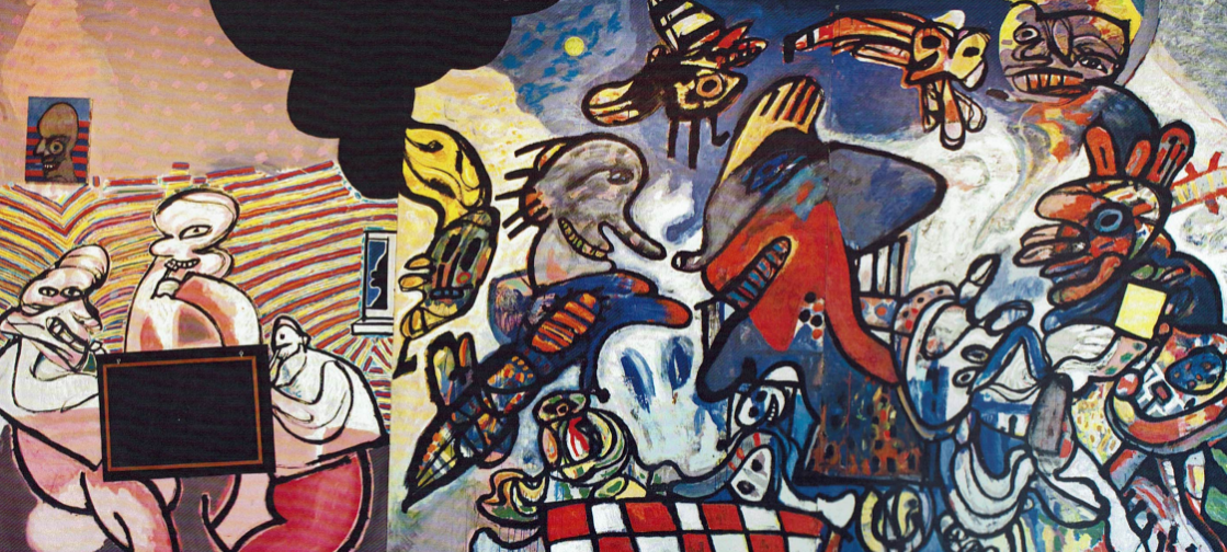 Dit schilderij van dichter en schilder Lucebert is gemaakt voor de eetzaal van de nieuwe studentenkantine in het huidige Tinbergen gebouw. Lucebert was -samen met Appel- onderdeel van de CoBrA beweging, die -in reactie op de oorlogen- een totaal nieuwe vrije kunst wilde, los van conventies uit het verleden. Het schilderij spat van de muur.