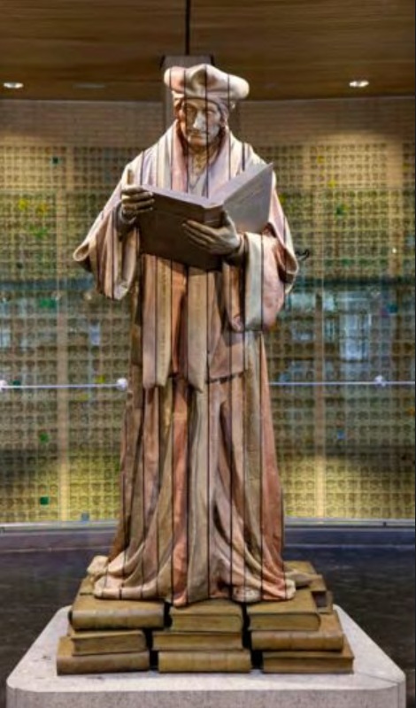 Het beeld is gebaseerd het beroemde standbeeld dat Hendrik de Keyser maakte, en dat nu voor de Laurenskerk staat. Maar vanwege die stapel boeken, verschillend gekleurde schijven met teksten erop, is het toch net even anders. Het maakt het een tot een bont geheel.