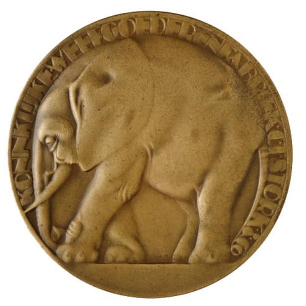 Hoe langer je naar deze penning kijkt, hoe meer je begrijpt dat het een topstuk is: de beeltenis van de olifant is zó treffend. En hoewel het ding zo plat is als een dubbeltje, weet de beeldhouwer/medailleur Chris van der Hoef (1875-1933) toch heel veel ruimte te suggereren. De olifant lijkt elk moment uit zijn ronde kadertje te stappen.