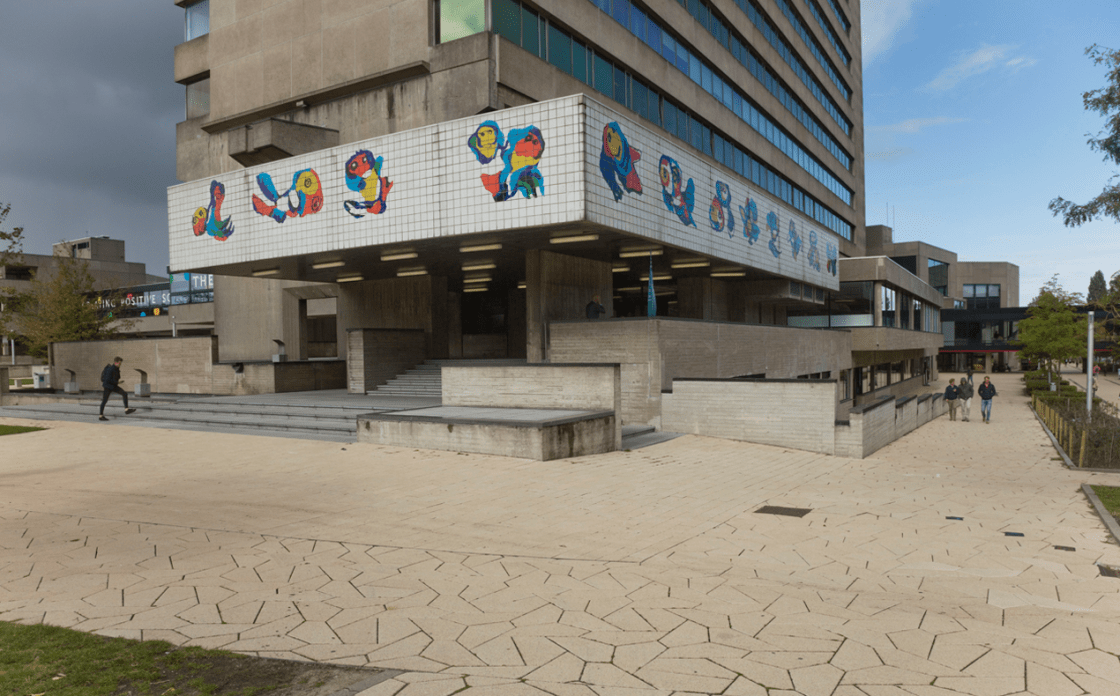 Studenten en medewerkers van onze universiteit hadden het voorrecht om dagelijks naar een Karel Appel te kijken. Want diens tegeltableau sierde al vanaf de opening de luifel boven de ingang van het Tinbergen-gebouw. Alleen, het is even niet meer zichtbaar, want tot 2027 wordt het gerenoveerd. Maar omdat het zo’n bijzonder en beeldbepalend kunstwerk is, schrijf ik er toch over.